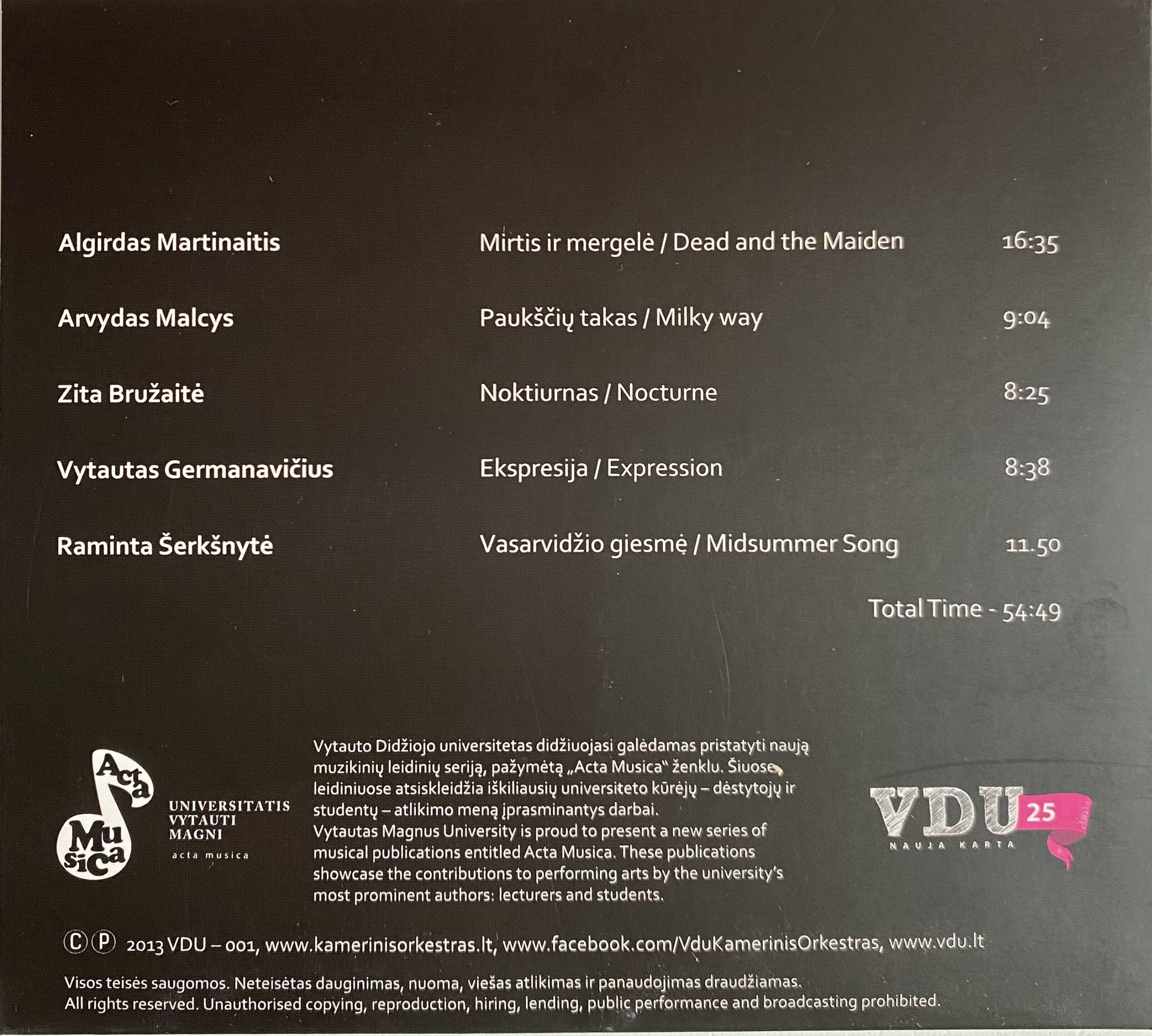 On the occasion of the tenth orchestras anniversary, the VMU Chamber Orchestra has presented a new CD which consists of the latest and the best pieces of written by these Lithuanian composers: Algirdas Martinaitis, Zita Bružaitė, Arvydas Malcis, Jievaras Jasinskis and Vidmantas Bartulis. Some of the works were created on the initiative and commission of the orchestra, others are the result of independent activities of composers.