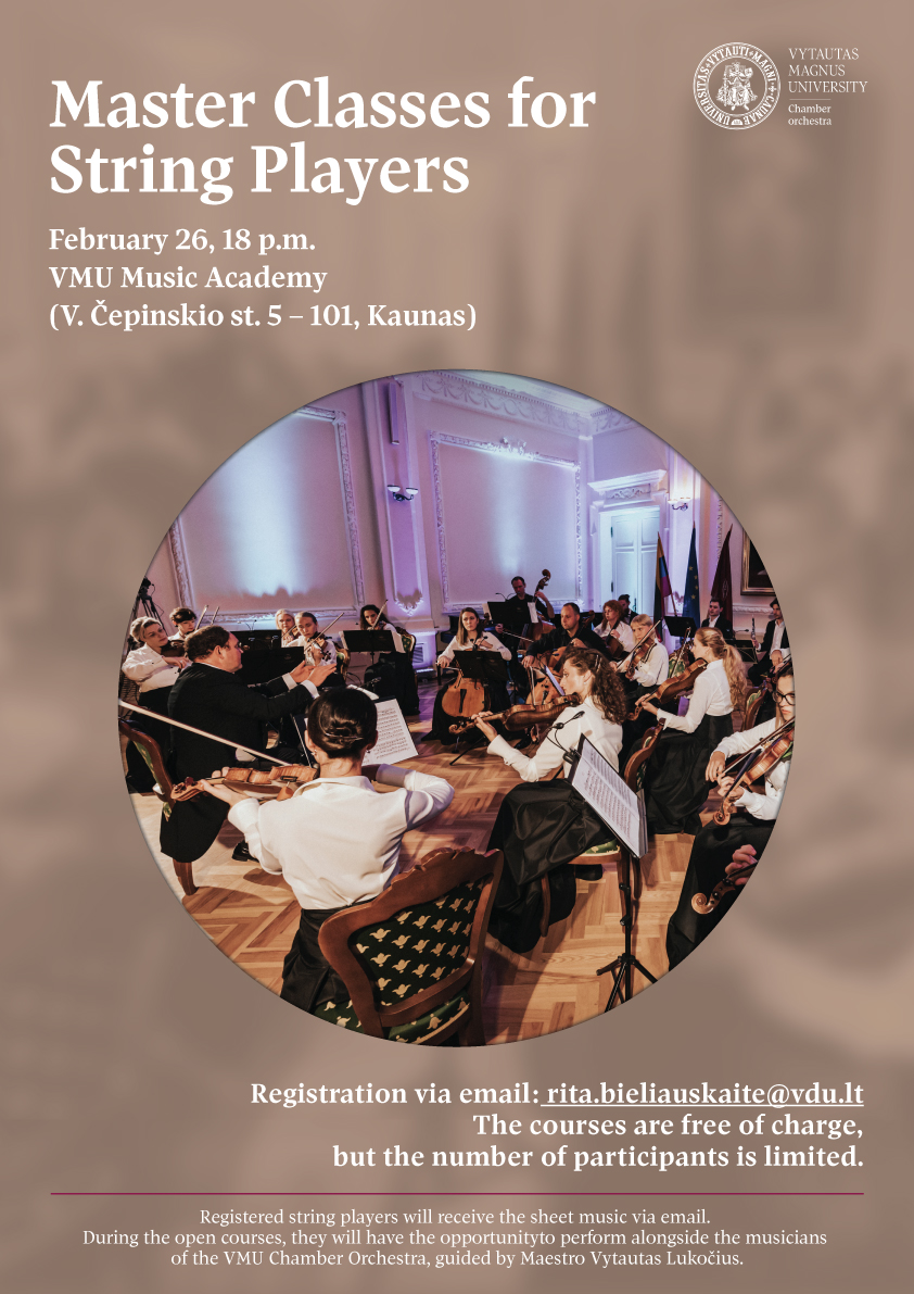 Registered string players will receive the sheet music via email. During the open courses, they will have the opportunity to perform alongside the musicians of the VMU Chamber Orchestra, guided by Maestro Vytautas Lukočius.